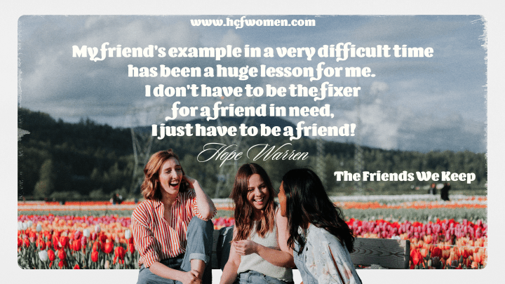At my worst moment in life, I, too, had four really good friends who came to me, sat with me, let me talk and cry, and cried with me. The afternoon I told Don about committing adultery, Don took me and my belongings to my mother and left me there. I’m not sure how my friends found out. Yes they were disappointed in what I had done, but they continued to love me. Yes, they had questions, but they didn’t condemn me with those questions. We live in a small town, and in a small town, everyone knows everything about everyone’s business. And most people like to share their opinions on that business. But these friends stayed beside me after Don brought me back home, and in the days, weeks, months, and even years following continued to show their love and support and to help Don and I to heal, grow stronger in our faith and marriage. Proverbs 17:17 says, “A friend loves at all times, and a brother is born for adversity.” My friend’s example in a very difficult time has been a huge lesson for me. I don’t have to be the fixer for a friend in need, I just have to be a friend!